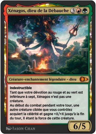Le saviez-vous ? Xenagos représenté en personne sur les cartes Xenagos, God of Revels et Xenagos, the Reveler est inspiré de Dionysos, le dieu grec de la vigne, du vin et de ses excès, de la folie et de la démesure. Initialement conçu avec une tête de chèvre, cela a été abandonné car il avait l'air "trop démoniaque et inhumain".