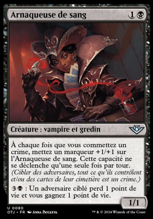 crime (Cibler des adversaires, quoi que ce soit qu'ils contrôlent et/ou des cartes dans leurs cimetières est un crime.), mettez un marqueur +1/+1 sur cette créature. Cette capacité ne se déclenche qu'une seule fois par tour.