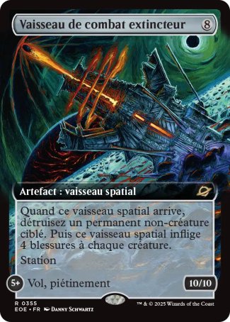 Quand ce vaisseau spatial arrive, détruisez un permanent non-créature ciblé. Puis ce vaisseau spatial inflige 4 blessures à chaque créature.