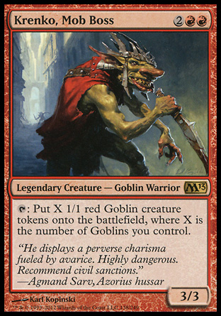 Le saviez-vous ? Les Goblins apparaissant sur l'illustration de Krenko's Command sont les mêmes que ceux apparaissant en arrière-plan de l'illustration de Krenko, Mob Boss. Toutes ces cartes sont illustrées par Karl Kopinski. |
