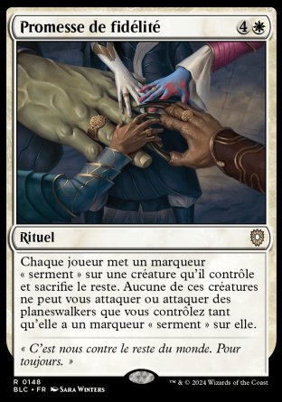 Chaque joueur met un marqueur "serment" sur une créature qu'il contrôle et sacrifie le reste. Aucune de ces créatures ne peut vous attaquer ou attaquer des planeswalkers que vous contrôlez tant qu'elle a un marqueur "serment" sur elle.