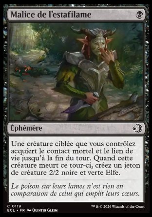 Une créature ciblée que vous contrôlez acquiert le contact mortel (N'importe quel nombre de blessures que cette créature inflige à une créature est suffisant pour la détruire.) et le lien de vie (Les blessures infligées par la créature font aussi gagner autant de points de vie à son contrôleur.) jusqu'à la fin du tour. Quand cette créature meurt ce tour-ci, créez un jeton de créature 2/2 noire et verte Elfe.