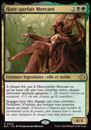 À chaque fois que le Haut-parfait Morcant ou qu'un autre elfe que vous contrôlez arrive, chaque adversaire applique gangrène 1 (Pour appliquer la gangrène, mettez un marqueur -1/-1 sur une créature que vous contrôlez.).