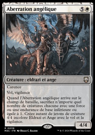 Quand l'Aberration angélique arrive, sacrifiez n'importe quel nombre de créatures chacune avec une force ou une endurance de base inférieure ou égale à 1. Créez autant de jetons de créature 4/4 incolore Eldrazi et Ange avec le vol (Cette créature ne peut être bloquée que par des créatures avec le vol ou la portée.) et la vigilance (Attaquer avec cette créature ne la fait pas s'engager.).