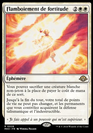 Jusqu'à la fin du tour, votre total de points de vie ne peut pas changer, et les permanents que vous contrôlez acquièrent la défense talismanique (Ce permanent ne peut pas être la cible de sorts ou de capacités que vos adversaires contrôlent.) et l' indestructible (Les effets qui disent "détruisez" ne détruisent pas ce permanent. Une créature indestructible ne peut pas être détruite par des blessures.).