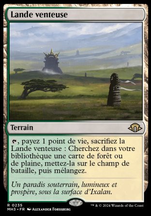 , payez 1 point de vie, sacrifiez la Lande venteuse : Cherchez dans votre bibliothèque une carte de forêt ou de plaine, mettez-la sur le champ de bataille, puis mélangez.