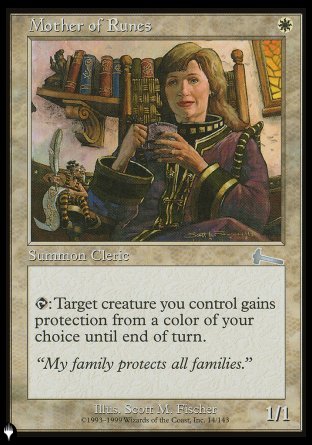 La carte Giver of Runes est une référence à Mother of Runes de par son nom, son coût de mana et son effet, qui peut également donner une protection incolore (les sorts et créatures incolores telles que les Eldrazis n'existant pas en 1999).