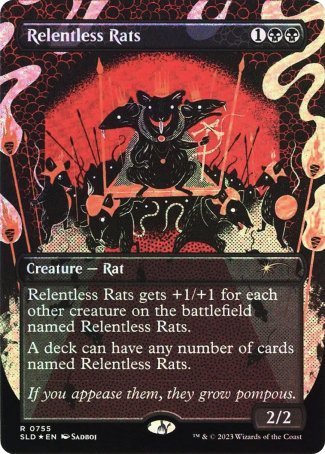 Relentless Rats est la toute première carte imprimée mentionnant explicitement dans son texte que son nombre d'exemplaires n'est pas limité dans un deck. Elle s'inspire de la carte Plague Rats, qui, d'après une légende urbaine de Magic (voir cette anecdote), aurait été jouée à l'origine dans des decks en contenant un nombre non limité à 4 exemplaires.