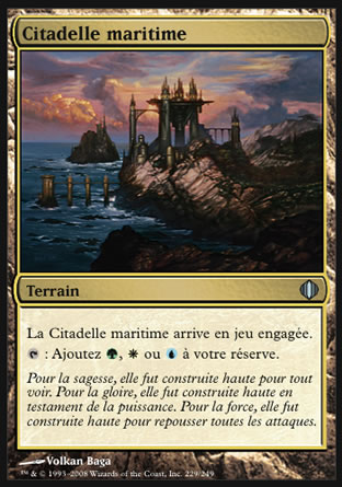 Le saviez-vous ? Sur la carte Sigil of the New Dawn, de l'édition Ultimate Masters, on peut distinguer la Seaside Citadel à l'horizon. Ces deux cartes sont illustrées par Volkan Baga. Les cinq cartes Seaside Citadel, Arcane Sanctum, Crumbling Necropolis, Savage Lands et Jungle Shrine, de l'édition Shards of Alara, forment un cycle de terrains tricolores. Les couleurs produites sont celles rattachées aux éclats d'Alara, respectivement : Bant, Esper, Grixis, Jund et Naya. Ce cycle a inspiré un cycle similaire, paru dans l'édition Khans of Tarkir (voir cette anecdote). |