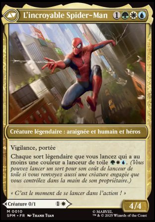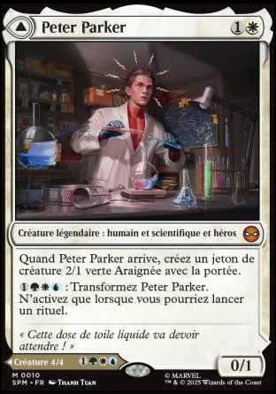 Quand Peter Parker arrive, créez un jeton de créature 2/1 verte Araignée avec la portée (Cette créature peut bloquer les créatures avec le vol.).