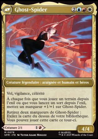 Retirez deux marqueurs de Ghost-Spider : Exilez la carte du dessus de votre bibliothèque. Vous pouvez jouer cette carte ce tour-ci.