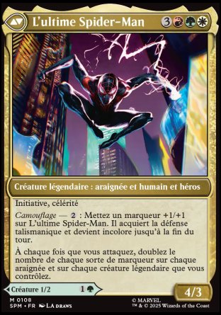 Initiative (Cette créature inflige des blessures de combat avant les créatures sans l'initiative.), célérité (Cette créature peut attaquer, et dès qu'elle arrive sous votre contrôle.)Camouflage — : Mettez un marqueur +1/+1 sur L'ultime Spider-Man. Il acquiert la défense talismanique (Ce permanent ne peut pas être la cible de sorts ou de capacités que vos adversaires contrôlent.) et devient incolore jusqu'à la fin du tour.