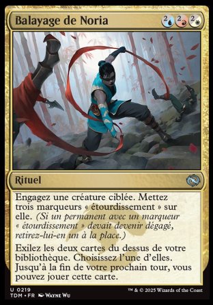 Le saviez-vous ? Les cinq cartes Kin-Tree Severance, Riverwheel Sweep, Rakshasa's Bargain, Defibrillating Current et Dragonclaw Strike, ainsi que les cinq cartes Reputable Merchant, Monastery Messenger, Gurmag Nightwatch, Reigning Victor et Temur Tawnyback, de l'édition Tarkir: Dragonstorm, forment un cycle d'éphémères/rituels tricolores, ainsi qu'un cycle de créatures avec la même intention, avec un coût de mana composé de manas hybrides monochromes (une couleur unique et deux manas génériques), chacun étant rattaché à un des wedges des clans de Tarkir, respectivement : Abzan, Jeskai, Sultai, Mardu et Temur (voir cette anecdote). Ils peuvent être joués pour uniquement du mana générique, mais coûtent de moins en moins cher en fonction du nombre des couleurs correspondantes des manas qui sont dépensés pour les lancer. Ce cycle est inspiré d'un autre cycle paru dans l'édition Shadowmoor (voir cette anecdote). Sur une illustration alternative de Wayne Wu pour la carte Riverwheel Sweep, de l'édition Tarkir: Dragonstorm, le personnage ne porte pas de bandeau sur ses yeux.
