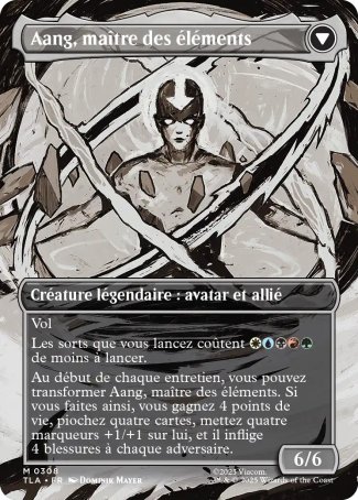 Au début de chaque entretien, vous pouvez transformer Aang, maître des éléments. Si vous faites ainsi, vous gagnez 4 points de vie, piochez quatre cartes, mettez quatre marqueurs +1/+1 sur lui, et il inflige 4 blessures à chaque adversaire.