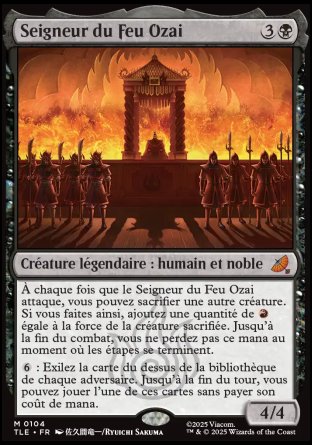 A chaque fois que le Seigneur du Feu Ozai attaque, vous pouvez sacrifier une autre créature. Si vous faites ainsi, ajoutez une quantité de