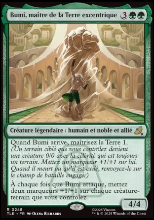Quand Bumi arrive, maîtrisez la Terre 1 (Un terrain ciblé que vous contrôlez devient une créature 0/0 avec la célérité (Cette créature peut attaquer, et dès qu'elle arrive sous votre contrôle.) qui est toujours un terrain. Mettez un marqueurs +1/+1 sur lui. Quand il meurt ou qu'il est exilé, renvoyez-le sur le champ de bataille engagé.).