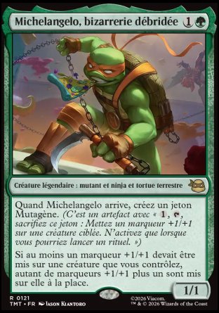 Quand Michelangelo arrive, créez un jeton Mutagène (C'est un artefact avec " , , sacrifiez ce jeton : Mettez un marqueur +1/+1 sur une créature ciblée. N'activez que lorsque vous pourriez lancer un rituel.").
