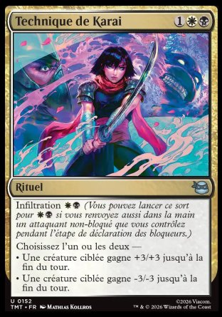 Le saviez-vous ? Les cinq cartes Leonardo's Technique, Kitsune's Technique, Splinter's Technique, Raphael's Technique et Michelangelo's Technique, ainsi que les cinq cartes The Last Ronin's Technique, Donatello's Technique, Shredder's Technique, Jennika's Technique et New Generation's Technique, de l'édition Teenage Mutant Ninja Turtles, forment un cycle appelé "Technique". La carte Karai's Technique s'apparente à ce cycle. Les cinq cartes Karai, Future of the Foot, Baxter Stockman, Pizza Face, Gastromancer, The Neutrinos et Genghis Frog, ainsi que les cinq cartes Karai's Technique, Brilliance Unleashed, Tainted Treats, Go Ninja Go et Lessons from Life, de l'édition Teenage Mutant Ninja Turtles, forment un cycle de créatures légendaires bicolores peu communes soutenant chacune un archétype de formats limités, ainsi qu'un cycle de sorts non-créatures avec la même intention.