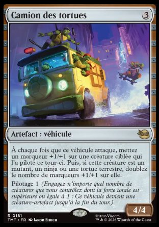 À chaque fois que ce véhicule attaque, mettez un marqueur +1/+1 sur une créature ciblée qui l'a piloté ce tour-ci. Puis, si cette créature est un mutant, un ninja ou une tortue terrestre, doublez le nombre de marqueurs +1/+1 sur elle.