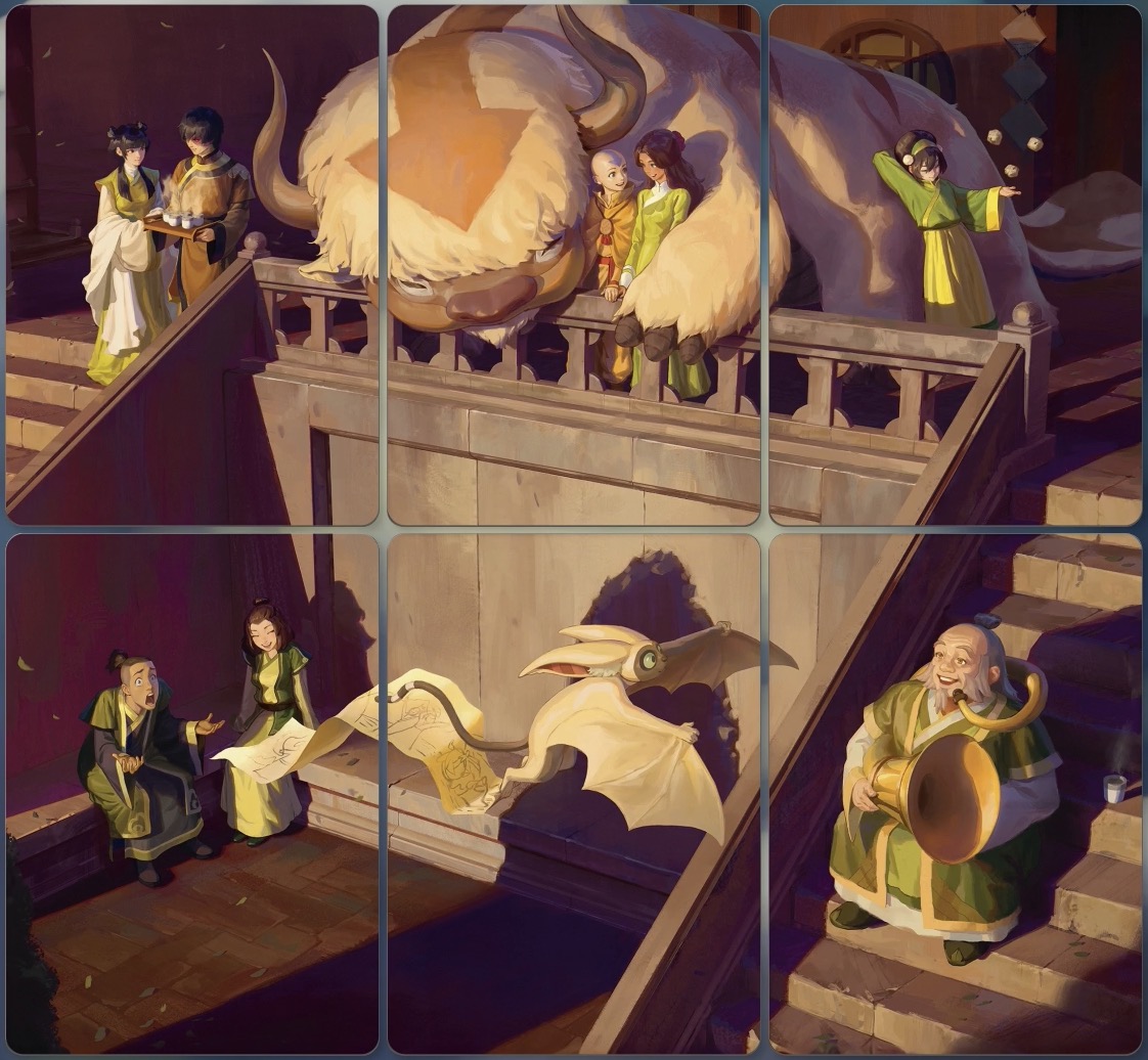 Les six cartes Mai and Zuko, Aang and Katara, Toph, Greatest Earthbender, Sokka and Suki, Momo's Heist et Uncle's Musings, de l'édition Avatar: The Last Airbender Eternal-Legal et illustrées par Brian Yuen, forment une seule image, représentant la scène "Tea Time at the Jasmine Dragon".