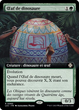Quand l'Œuf de dinosaure meurt, vous pouvez découvrir X (Exilez les cartes du dessus de votre bibliothèque jusqu'à ce que vous exiliez une carte non-terrain avec une valeur de mana inférieure ou égale à X. Lancez-la sans payer son coût de mana ou mettez-la dans votre main. Mettes le reste au-dessous de votre bibliothèque dans un ordre aléatoire.), X étant son endurance.