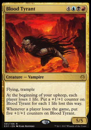Au début de votre entretien, chaque joueur perd 1 point de vie. Mettez un marqueur +1/+1 sur le Tyran de sang pour chaque point de vie perdu de cette manière.