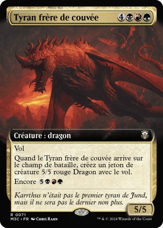 Le saviez-vous ? La carte Broodmate Tyrant est une référence à Broodmate Dragon de par son nom, son identité couleur, son type de créature, son illustration et ses capacités, notamment sa capacité déclenchée d'arrivée qui crée un jeton "jumeau".