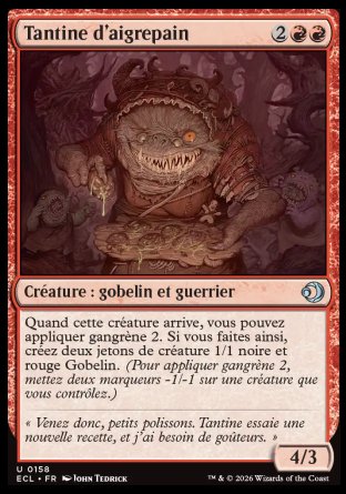 Quand cette créature arrive, vous pouvez appliquer gangrène 2 (Pour appliquer la gangrène, mettez deux marqueurs -1/-1 sur une créature que vous contrôlez.). Si vous faites ainsi, créez deux jetons de créature 1/1 noire et rouge Gobelin.