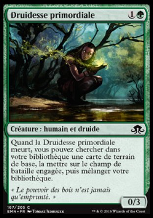 Quand la Druidesse primordiale meurt, vous pouvez chercher dans votre bibliothèque une carte de terrain de base, la mettre sur le champ de bataille engagée, puis mélanger.