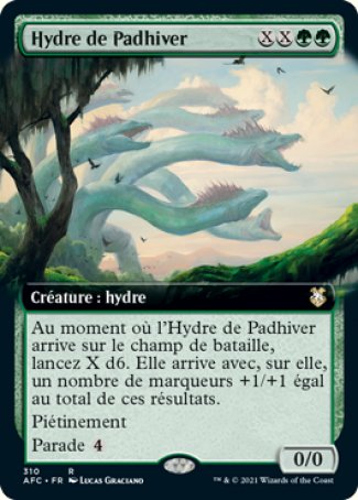 Au moment où l'Hydre de Padhiver arrive, lancez X d6. Elle arrive avec, sur elle, un nombre de marqueurs +1/+1 égal au total de ces résultats.