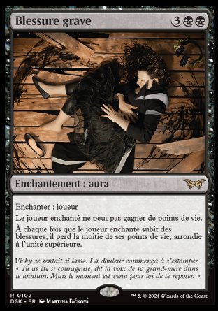 À chaque fois que le joueur enchanté subit des blessures, il perd la moitié de ses points de vie, arrondie à l'unité supérieure.