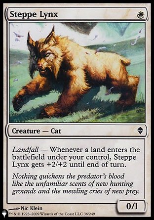 Toucheterre — À chaque fois qu'un terrain que vous contrôlez arrive, le Lynx des steppes gagne +2/+2 jusqu'à la fin du tour.