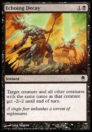 Le saviez-vous ? Les cinq cartes Echoing Calm, Echoing Truth, Echoing Decay, Echoing Ruin et Echoing Courage, de l'édition Darksteel, forment un cycle appelé "Echoing". De plus leurs textes d'ambiance se font écho. La carte Echoing Return parue ensuite fait référence à ce cycle. |