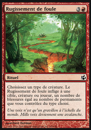 Choisissez un type de créature. Le Rugissement de foule inflige à n'importe quelle cible autant de blessures que de permanents que vous contrôlez du type choisi.