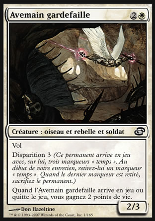 Vol (Cette créature ne peut être bloquée que par des créatures avec le vol ou la portée.)Disparition 3 (Ce permanent arrive avec, sur lui, trois marqueur(s) "temps". Au début de votre entretien, retirez-lui un marqueur "temps". Quand le dernier marqueur est retiré, sacrifiez ce permanent.)