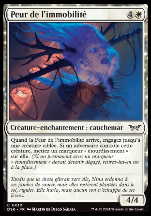 Quand la Peur de l'immobilité arrive, engagez jusqu'à une créature ciblée. Si un adversaire contrôle cette créature, mettez un marqueur "étourdissement (Si un permanent avec un marqueur "étourdissement" devait devenir dégagé, retirez-lui en un à la place.)" sur elle.