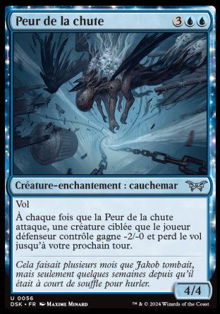 À chaque fois que la Peur de la chute attaque, une créature ciblée que le joueur défenseur contrôle gagne -2/-0 et perd le