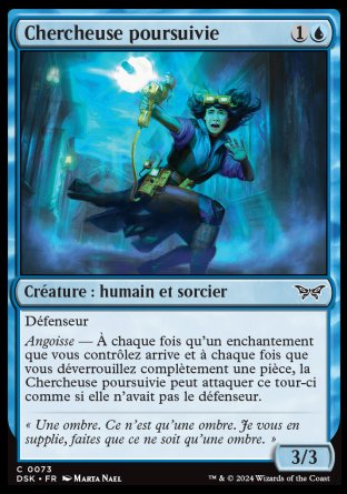 Angoisse — À chaque fois qu'un enchantement que vous contrôlez arrive et à chaque fois que vous déverrouillez complètement une pièce, la Chercheuse poursuivie peut attaquer ce tour-ci comme si elle n'avait pas le défenseur (Cette créature ne peut pas attaquer.).