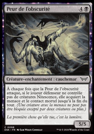 À chaque fois que la Peur de l'obscurité attaque, si le joueur défenseur ne contrôle pas de créature Nitescence, elle acquiert la menace (Cette créature ne peut pas être bloquée excepté par deux créatures ou plus.) et le contact mortel (N'importe quel nombre de blessures que cette créature inflige à une créature est suffisant pour la détruire.) jusqu'à la fin du tour.