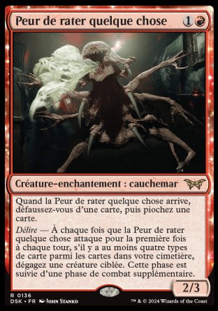 Délire — À chaque fois que la Peur de rater quelque chose attaque pour la première fois à chaque tour, s'il y a au moins quatre types de carte parmi les cartes dans votre cimetière, dégagez une créature ciblée. Cette phase est suivie d'une phase de combat supplémentaire.