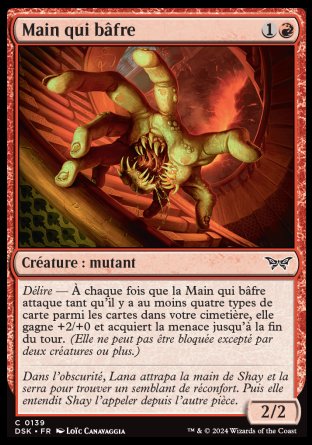 Délire — À chaque fois que la Main qui bâfre attaque tant qu'il y a au moins quatre types de carte parmi les cartes dans votre cimetière, elle gagne +2/+0 et acquiert la menace (Cette créature ne peut pas être bloquée excepté par deux créatures ou plus.) jusqu'à la fin du tour.