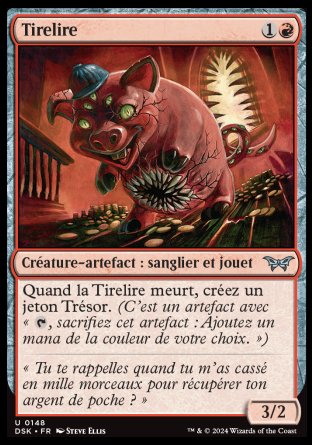 Quand la Tirelire meurt, créez un jeton Trésor (Un trésor est un artefact avec " , sacrifiez cet artefact : Ajoutez un mana de la couleur de votre choix.").