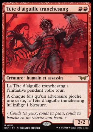 Le saviez-vous ? Les cartes Razorkin Needlehead et Unstoppable Slasher, de l'édition Duskmourn: House of Horrors, s'inspirent d'antagonistes que l'on voit dans les films d'horreur de genre Slasher, semblant être des meurtriers invincibles ou morts-vivants, tels que Jason, Freddy Krueger ou encore Leatherface. La carte Killer's Mask, quant à elle, fait plus particulièrement référence au sous-genre Slasher avec un tueur masqué, comme par exemple dans les séries de films suivantes : Massacre à la tronçonneuse, Halloween, Vendredi 13 et Scream. |