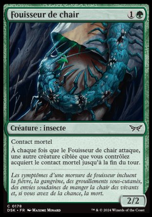 À chaque fois que le Fouisseur de chair attaque, une autre créature ciblée que vous contrôlez acquiert le contact mortel (N'importe quel nombre de blessures que cette créature inflige à une créature est suffisant pour la détruire.) jusqu'à la fin du tour.
