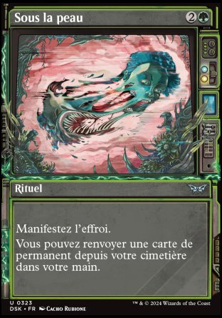 Manifestez l'effroi (Pour manifester l'effroi, regardez les deux cartes du dessus de votre bibliothèque. Mettez l'une d'elles sur le champ de bataille face cachée comme une créature 2/2 et l'autre dans votre cimetière. Retournez-la face visible à tout moment pour son coût de mana si c'est une carte de créature.).