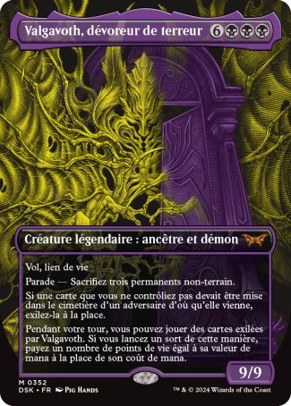 Pendant votre tour, vous pouvez jouer des cartes exilées par Valgavoth. Si vous lancez un sort de cette manière, payez un nombre de points de vie égal à sa valeur de mana à la place de son coût de mana.