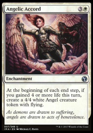 Au début de chaque étape de fin, si vous avez gagné au moins 4 points de vie ce tour-ci, créez un jeton de créature 4/4 blanche Ange avec le vol (Cette créature ne peut être bloquée que par des créatures avec le vol ou la portée.).