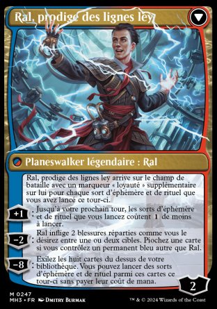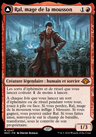 À chaque fois que vous lancez un sort d'éphémère ou de rituel pendant votre tour, jouez à pile ou face. Si vous perdez, Ral vous inflige 1 blessure. Si vous gagnez, vous pouvez exiler Ral. Si vous faites ainsi, renvoyez-le sur le champ de bataille, transformé, sous le contrôle de son propriétaire.