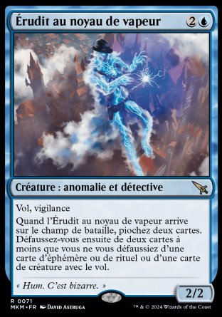 Quand l'Érudit au noyau de vapeur arrive, piochez deux cartes. Défaussez-vous ensuite de deux cartes à moins que vous ne vous défaussiez d'une carte d'éphémère ou de rituel ou d'une carte de créature avec le vol (Cette créature ne peut être bloquée que par des créatures avec le vol ou la portée.).