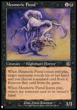 Quand cette créature arrive, un adversaire ciblé révèle sa main et vous y choisissez une carte non-terrain. Exilez cette carte.